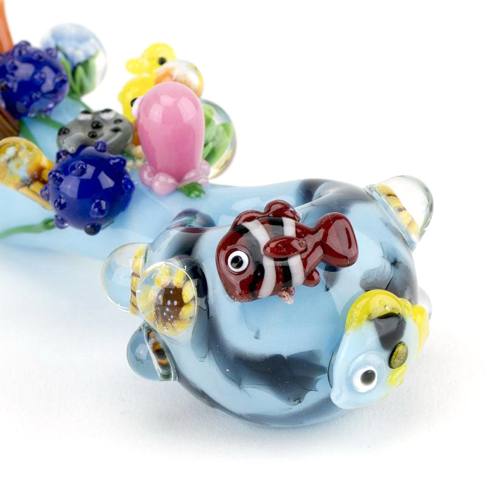 This 4.75-inch Empire Glassworks Spoon Pipe is meticulously crafted from durable borosilicate glass. The spoon style hand pipe features an intricate Great Barrier Reef design, making it a stunning and unique piece in any collection. Whether for personal use or as a decorative item, this hand pipe is a work of art.