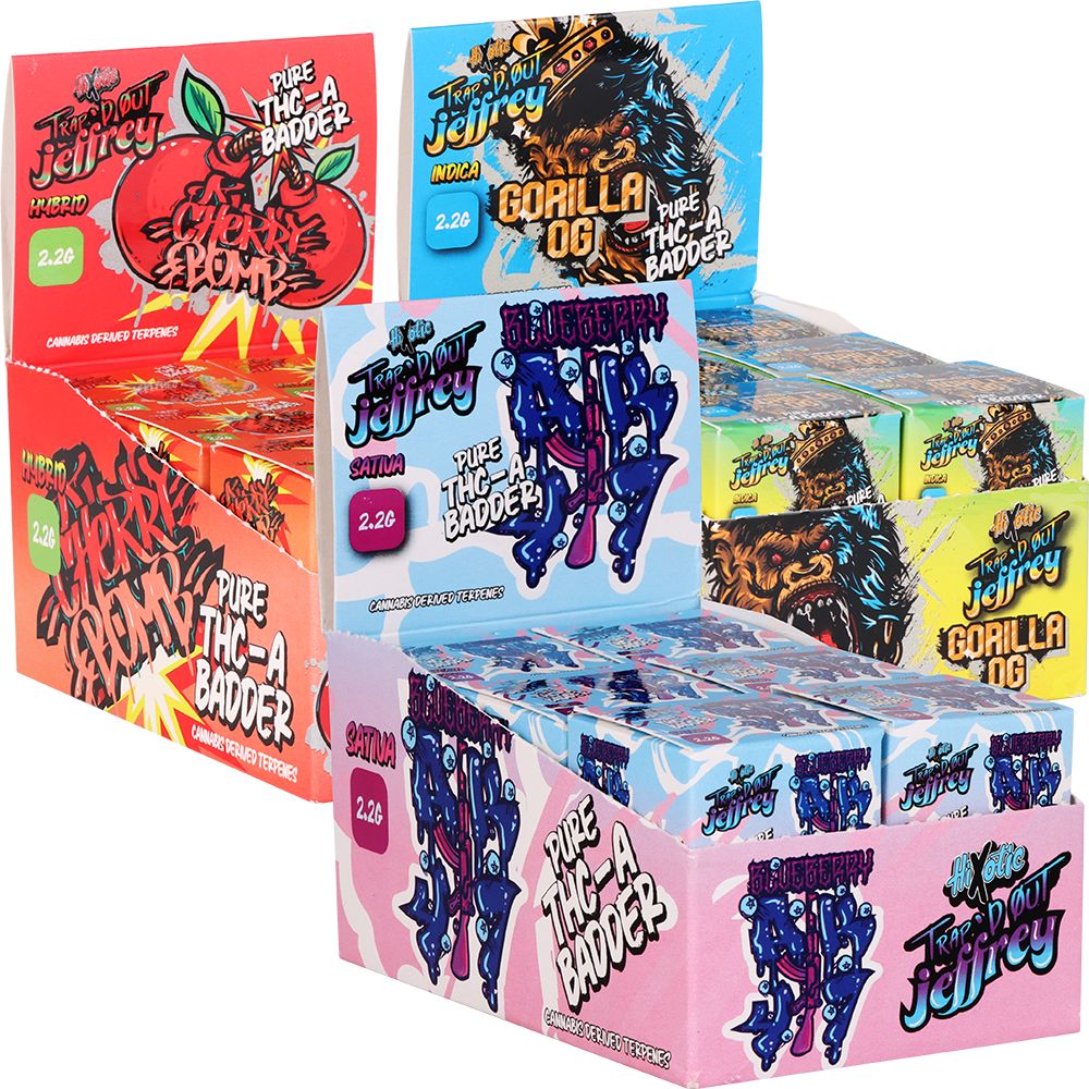 Introducing the HiXotic Trap'd Out Jeffery Pure THCA Badder, a premium offering in the realm of cannabis concentrates. This display contains 12 containers, each filled with 2.2 grams of meticulously crafted THCA badder, boasting an impressive 90%+ purity. Infused with cannabis-derived terpenes (CDT), this product enhances your experience with rich, flavorful profiles. Perfect for both connoisseurs and casual users, this badder stands out in the highly competitive market of cannabis concentrates.