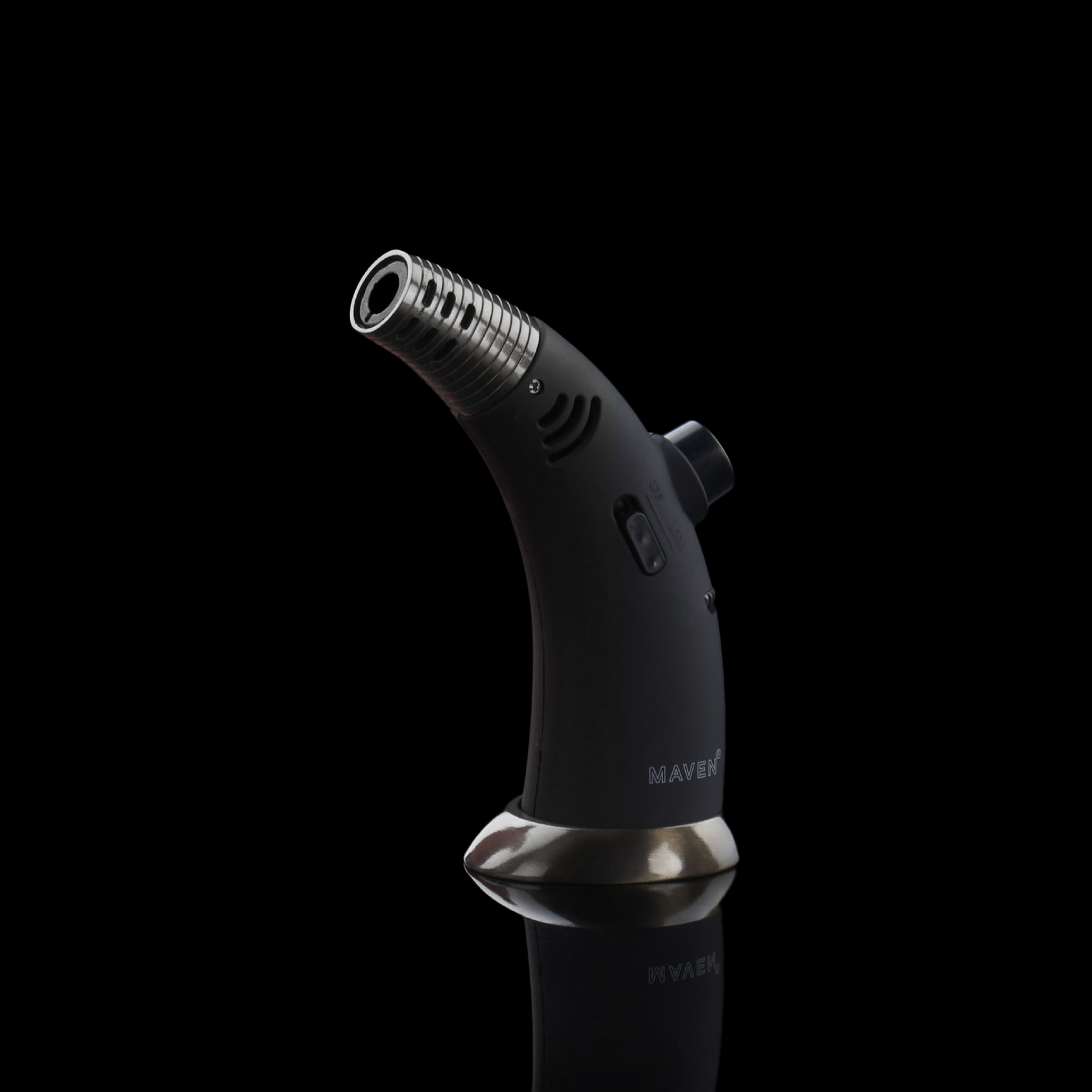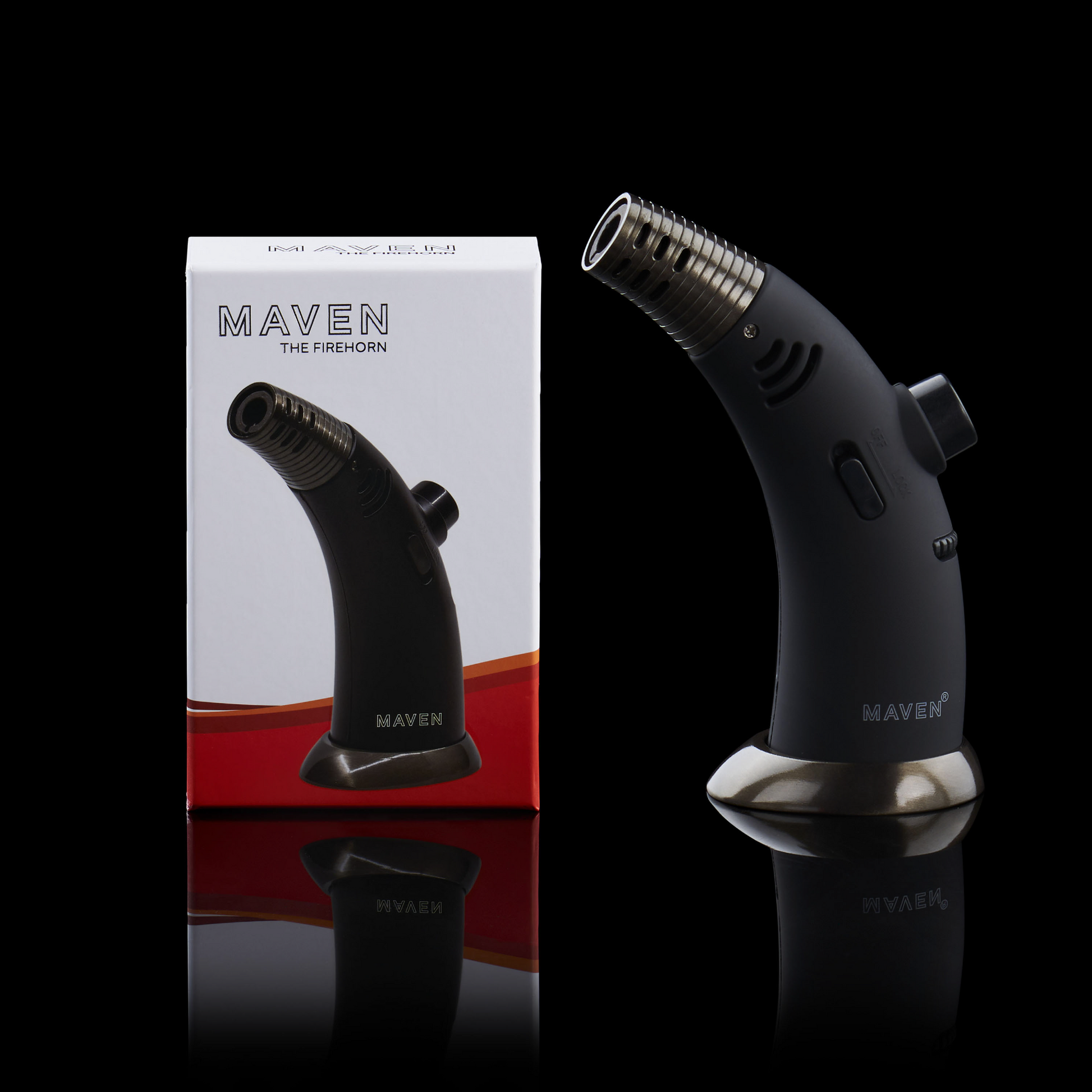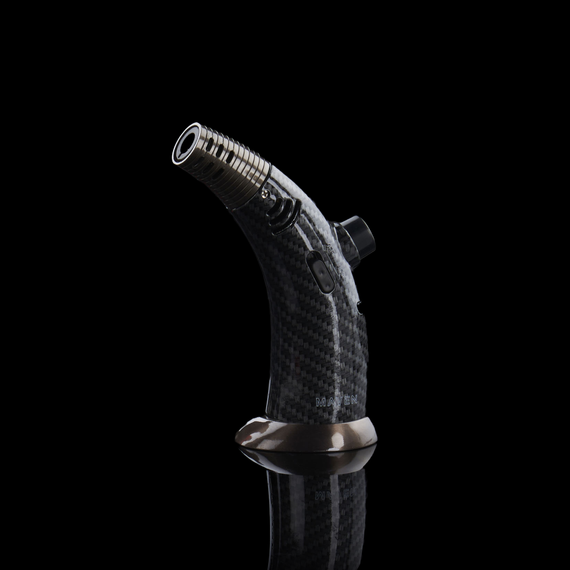 The Maven Firehorn is not your ordinary handheld torch. With a solid base foundation and a sleek design, this torch stands out from the rest. Standing at 5 inches tall, it features a wide refillable butane tank structure and an angled top for precise and strategic lighting.