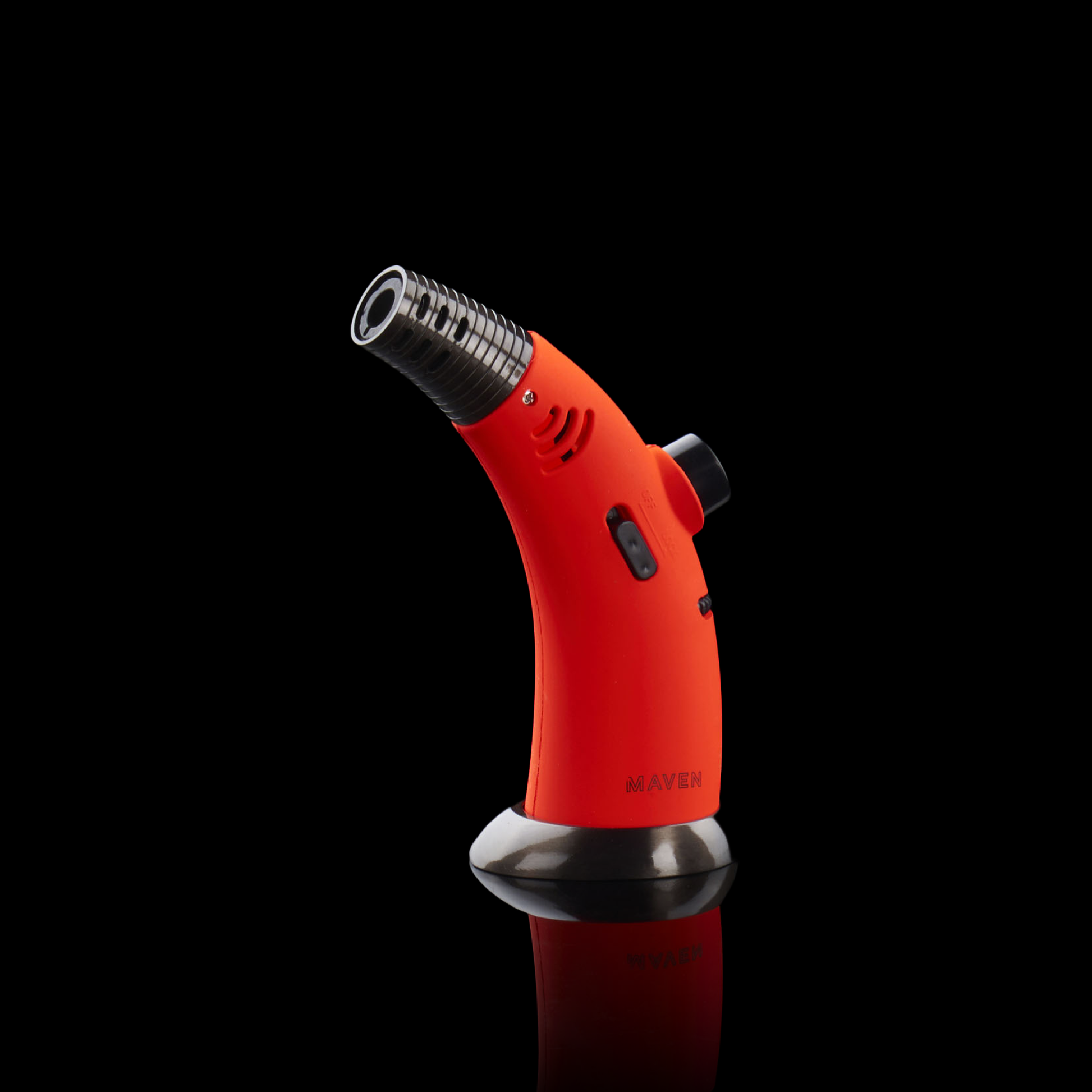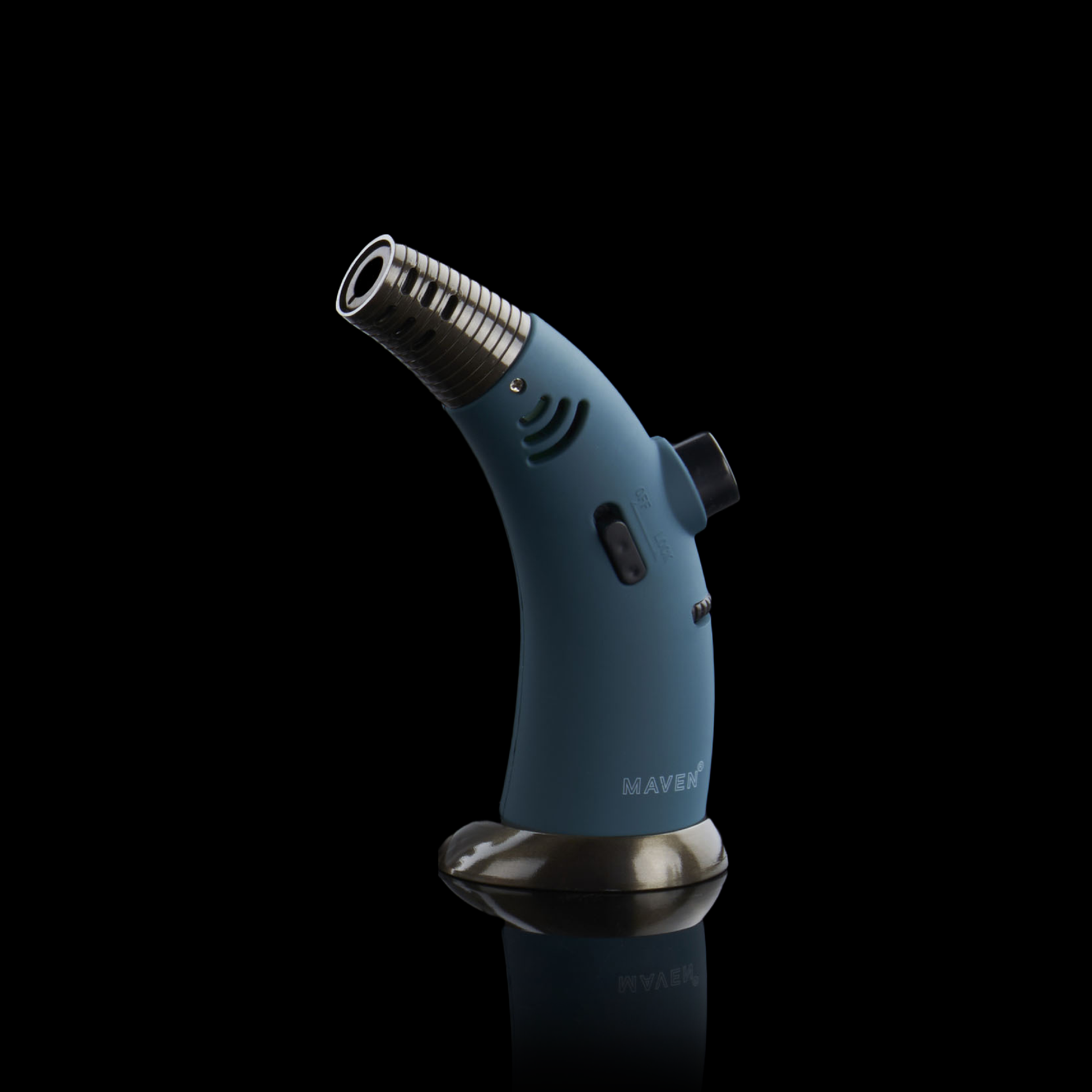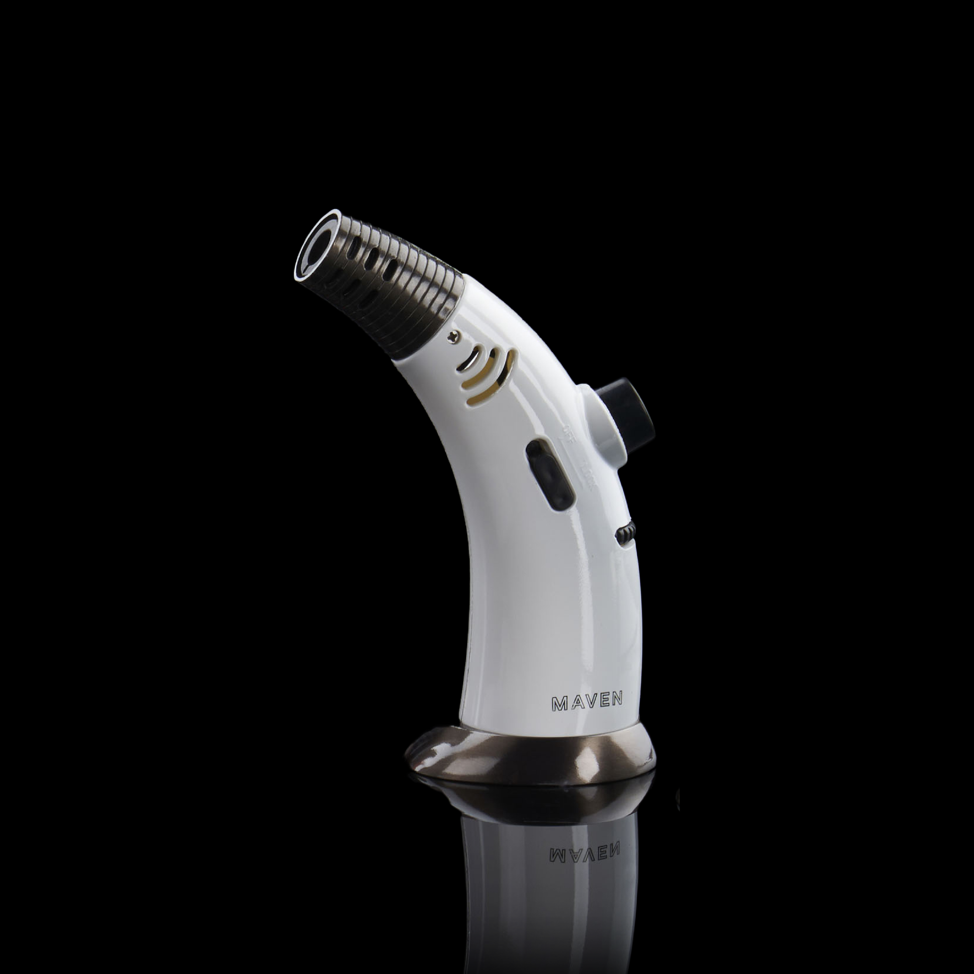 The Maven Firehorn is not your ordinary handheld torch. With a solid base foundation and a sleek design, this torch stands out from the rest. Standing at 5 inches tall, it features a wide refillable butane tank structure and an angled top for precise and strategic lighting.