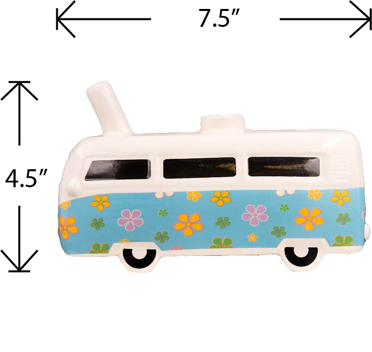 This fun and adorable novelty adult gift item features the shape of a bus with a colorful hippie style flower design on the side. Attached to the top of the bus is a pipe where you can pack your tobacco and light it. The smoke filters up to the mouthpiece at the front of the bus.