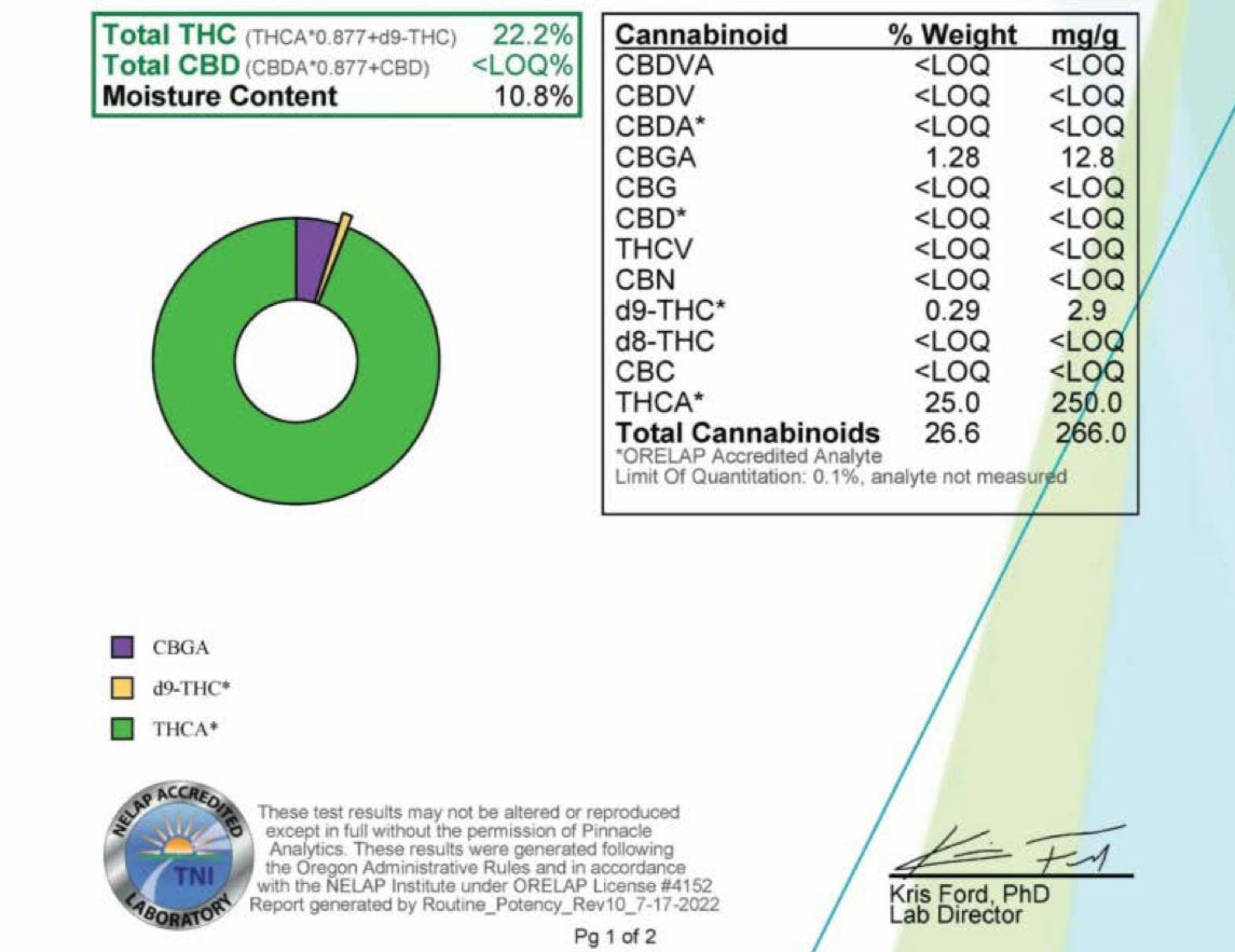 <p>Analysis performed via HPLC/DAD by Pinnacle Analytics, Medford, Oregon. Certified by ORELAP and documented under state-compliant cannabinoid profiling standards.</p>